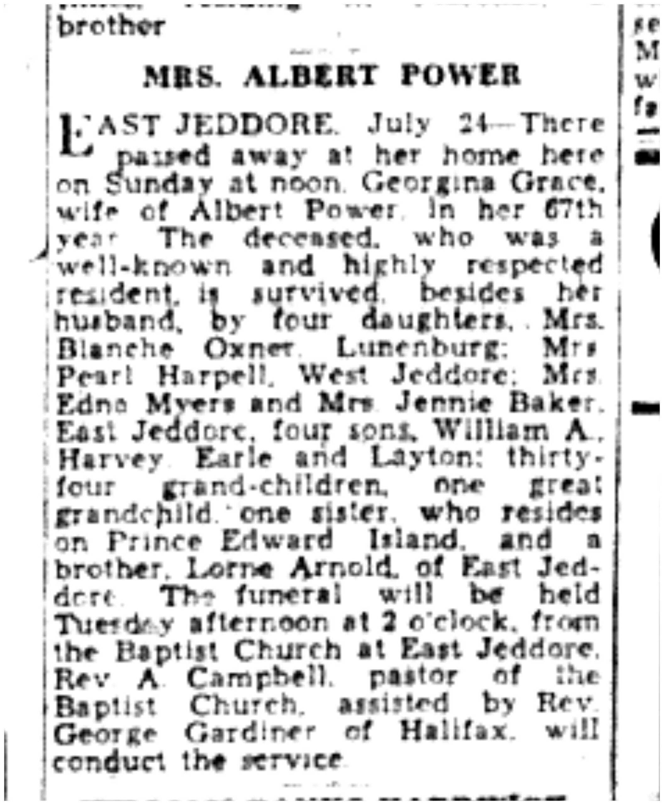 East Jeddore, July 24 – There passed away at her home here on Sunday at noon Georgina Grace, wife of Albert Power, in her 67th year. The deceased, who was a well-known and highly respected resident, is survived besides her husband by four daughters, Mrs. Blanche Oxner, Lunenburg; Mrs. Pearl Harpell, West Jeddore; Mrs. Edna Myers and Mrs. Jennie Baker, East Jeddore; four sons, William A, Harvey, Earle, and Layton; thirty-four grand-children, one great-grandchild, one sister who resides on Prince Edward Island, and a brother, Lorne Arnold, of East Jeddore. The funeral will be held Tueday afternoon at 2 o’clock from the Baptist Church at East Jeddore. Rev. A. Campbell, pastor of the Baptist Church, assisted by Rev. George Gardiner of Halifax, will conduct the service.